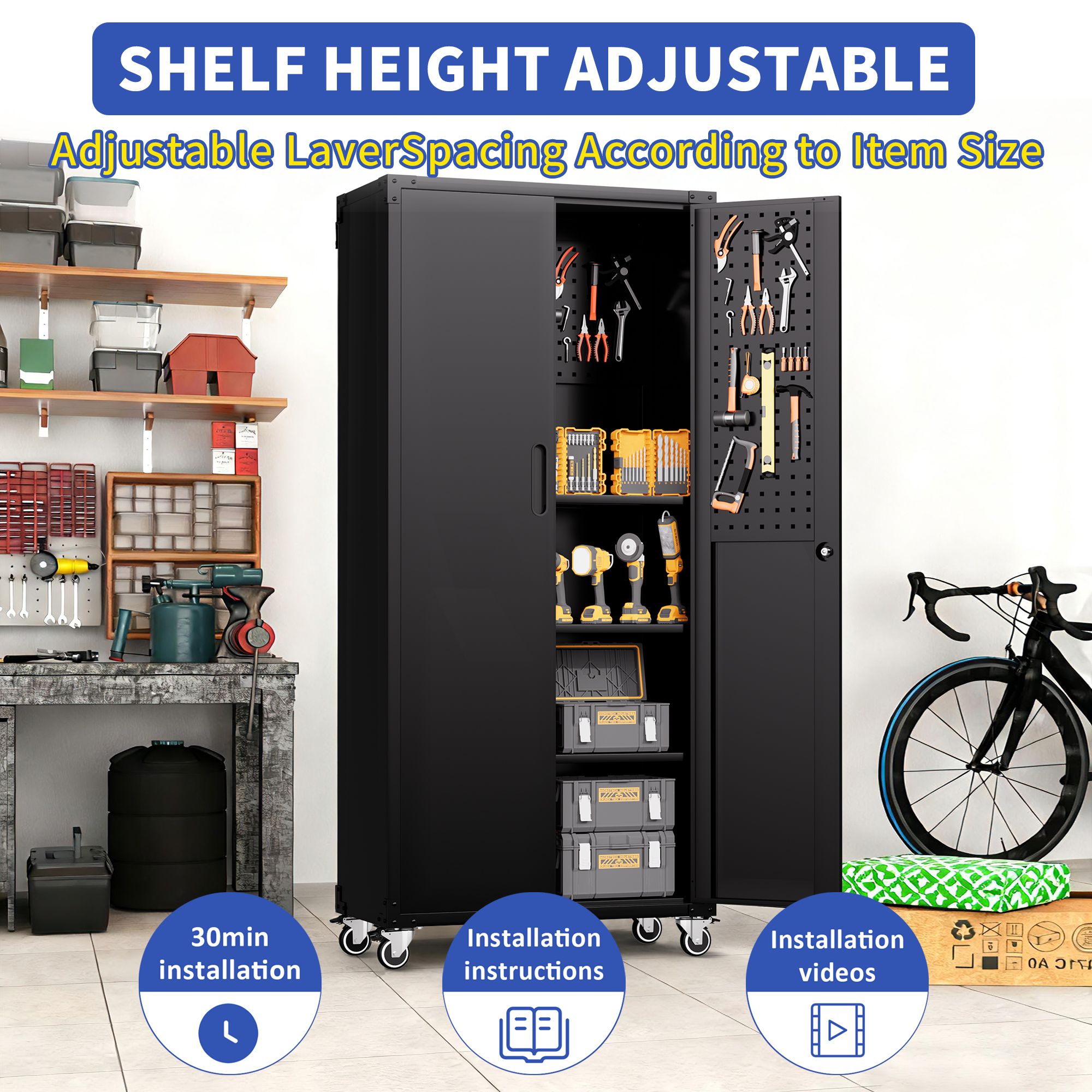 Product Description:Why Choose Our All-Black Metal Garage Storage Cabinet?Discover unparalleled storage and organization with our 71" Metal Garage Storage Cabinet in a sleek all-black finish. This Heavy-Duty Tool Storage Cabinet is designed for those who demand the best in both utility and durability while complementing their space with a modern, professional appearance. Our 71" Metal Garage Storage Cabinet is backed by our commitment to quality and customer satisfaction. Experience the convenience and efficiency of a well-organized workspace with our reliable storage solution.Enhanced Mobility: Our cabinet's design allows for effortless movement, making it simple to reposition your storage solution wherever it's needed.Superior Load Capacity: With the ability to bear significant weight, this cabinet is ideal for heavy-duty storage requirements.Multiple Storage Options: The adjustable dividers and hinged doors provide a range of storage configurations to suit any need.Safety and Protection: Designed with safety in mind, our cabinet includes rubber covers and top installation holes to secure it in place.Sleek All-Black Design: The attractive all-black finish not only provides a modern, professional look but also offers enhanced protection against rust and wear, ensuring your cabinet maintains its appearance over time.