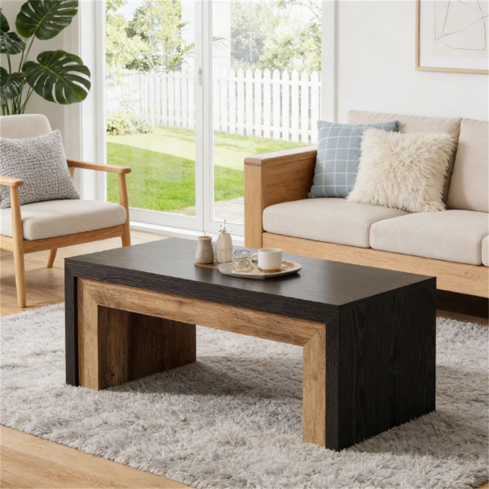 Modern Color-Block Design - This trendy coffee table features a chic black and brown color-block design with clear, natural wood grain. It lends an elegant flair to your living room.