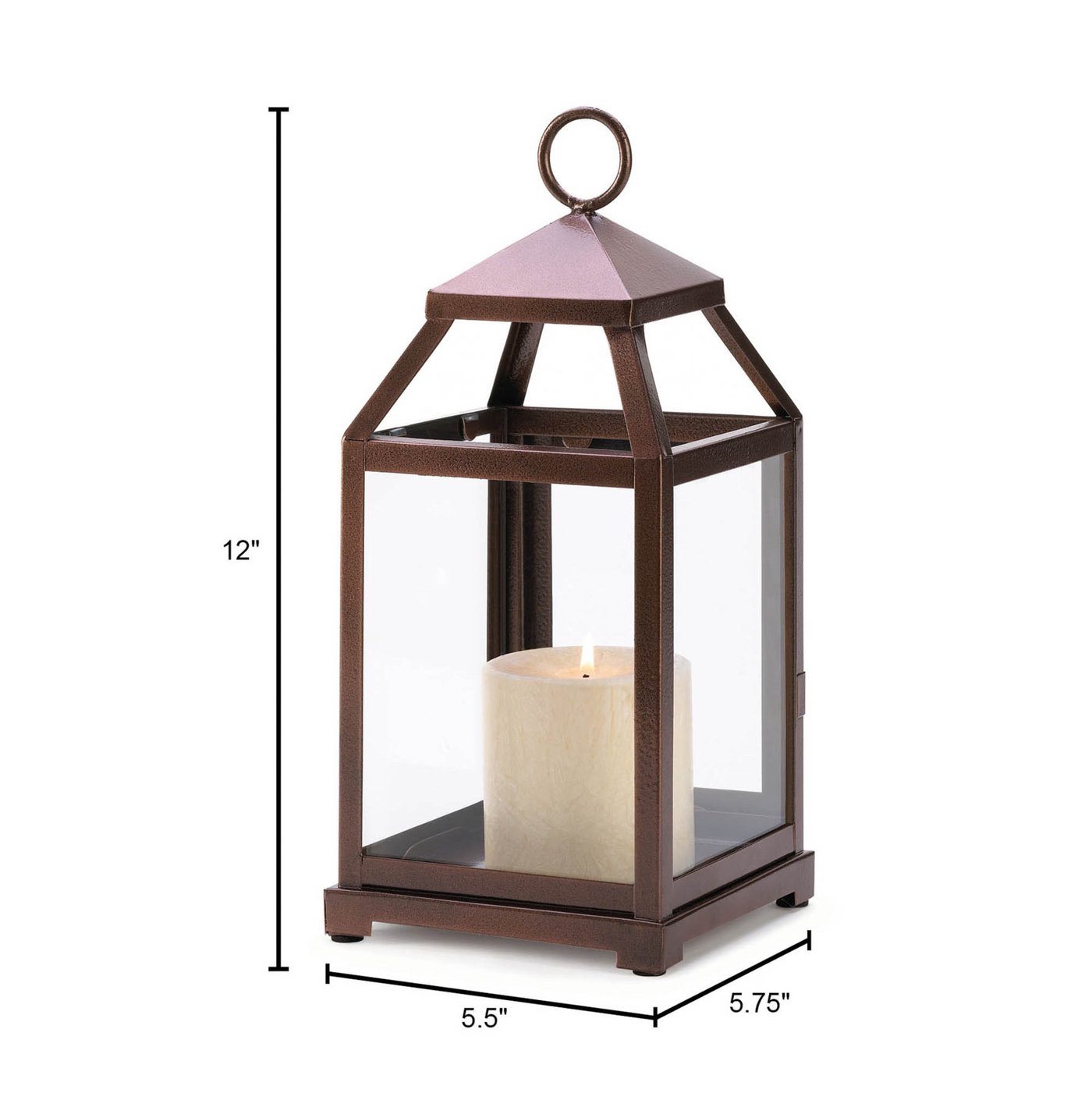 • A burnished copper glaze brightens the modernized framework of this glass-paneled hurricane lamp, making it the perfect finish for any special setting. A handsomely understated addition to your favorite room! Loop at top for hanging; can also stand freely on table or shelf.